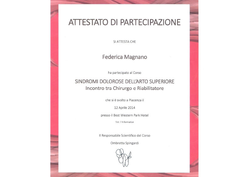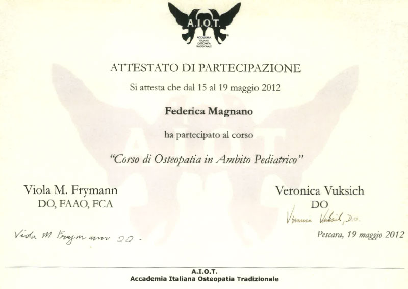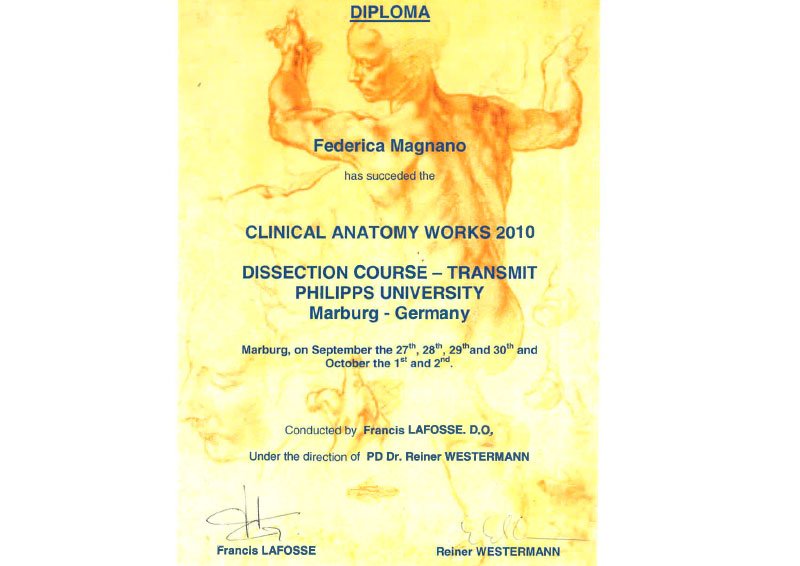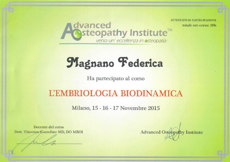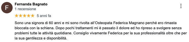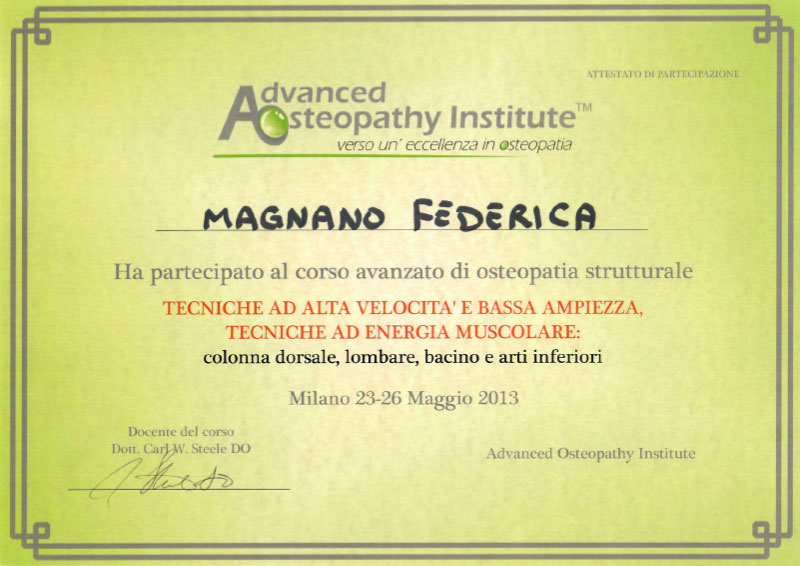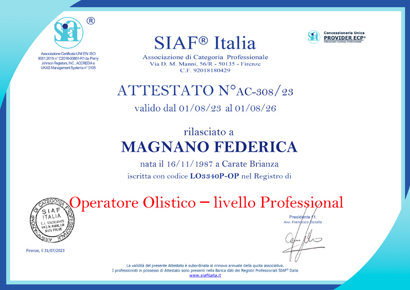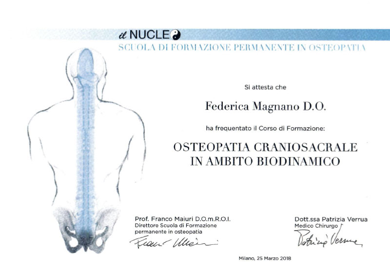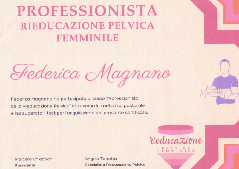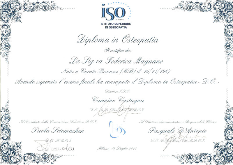Mi chiamo Federica Magnano e sono un’Osteopata iscritta al ROI (Registro degli osteopati d’Italia) dal 2012 a seguito di un percorso universitario di 5 anni e di un tirocinio clinico di 1.100 ore. La laurea in Osteopatia è stato solo il primo passo della mia formazione e specializzazione. In questi 10 anni di attività mi sono specializzata nelle problematiche femminili e posturali frequentando numerosi corsi di aggiornamento e di abilitazione e studiando articoli scientifici e libri inerenti al funzionamento del nostro corpo. Grazie a tutta l'esperienza maturata in questi 10 anni, ho codificato un mio metodo di lavoro, che tiene in considerazione la persona a 360 gradi e che ha l'obiettivo di accompagnarla a vivere il suo stato naturale di benessere.